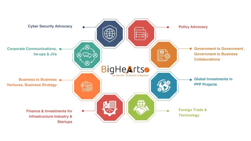 BigHearts Venture LLP is committed to the advocacy of holistic development by providing assistance, guidance & consultancy for businesses and technological ventures. BigHearts Venture™ offers a comprehensive understanding of government affairs and assists private corporations to collaborate with them or vice versa, with the aim of developing better technologies and enhancing the infrastructural services of society.